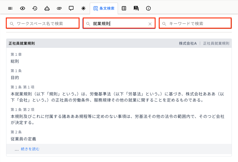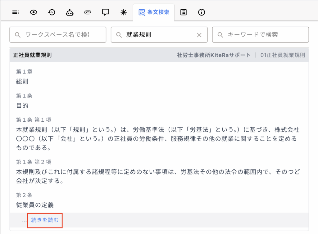 条文検索機能では、作成した他の規程や、作成前のKiteRaの雛形を検索・参照することができます。
