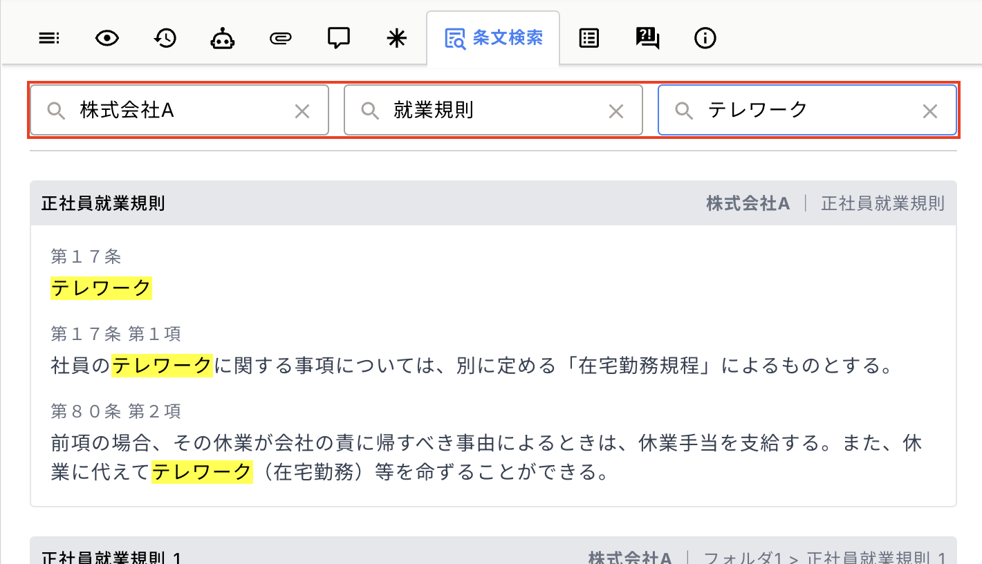 条文検索機能では、作成した他の規程や、作成前のKiteRaの雛形を検索・参照することができます。