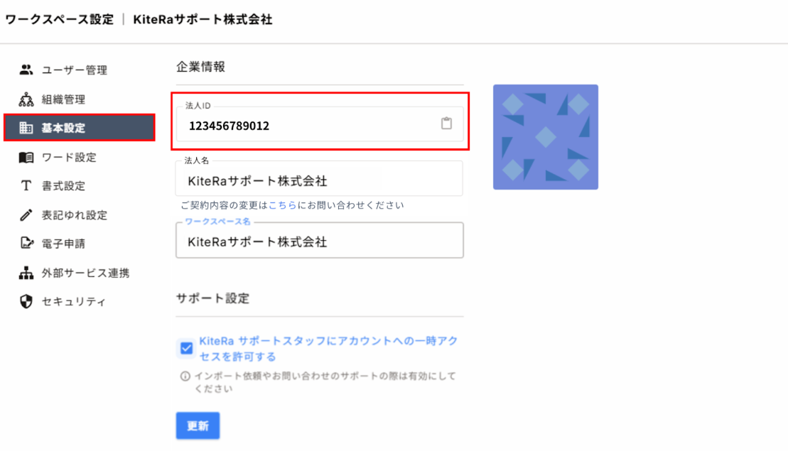 [基本設定]画面で「法人ID」の右横に表示されるコピーアイコンをクリックすると、ワークスペースへのログインURLをコピーできます。