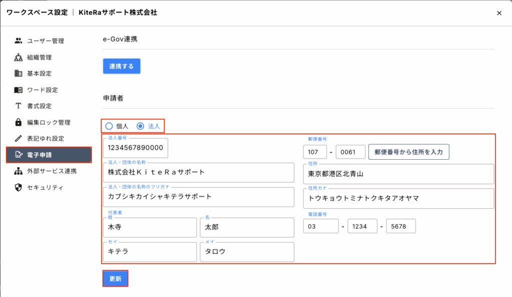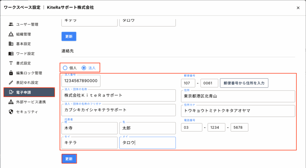 1.連絡先欄に申請者情報と同様の企業情報を入力