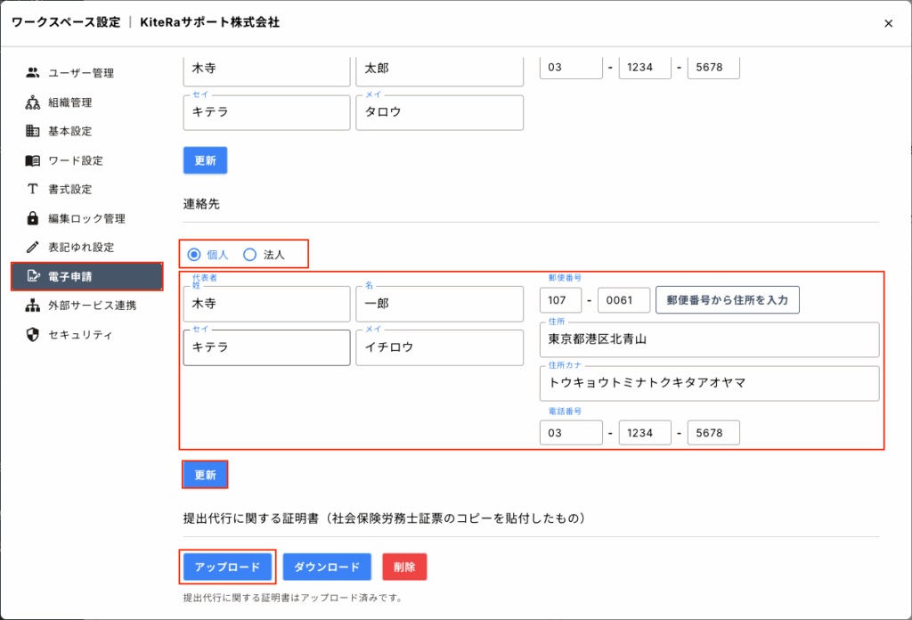 1.連絡先欄に代行する社会保険労務士の情報を入力