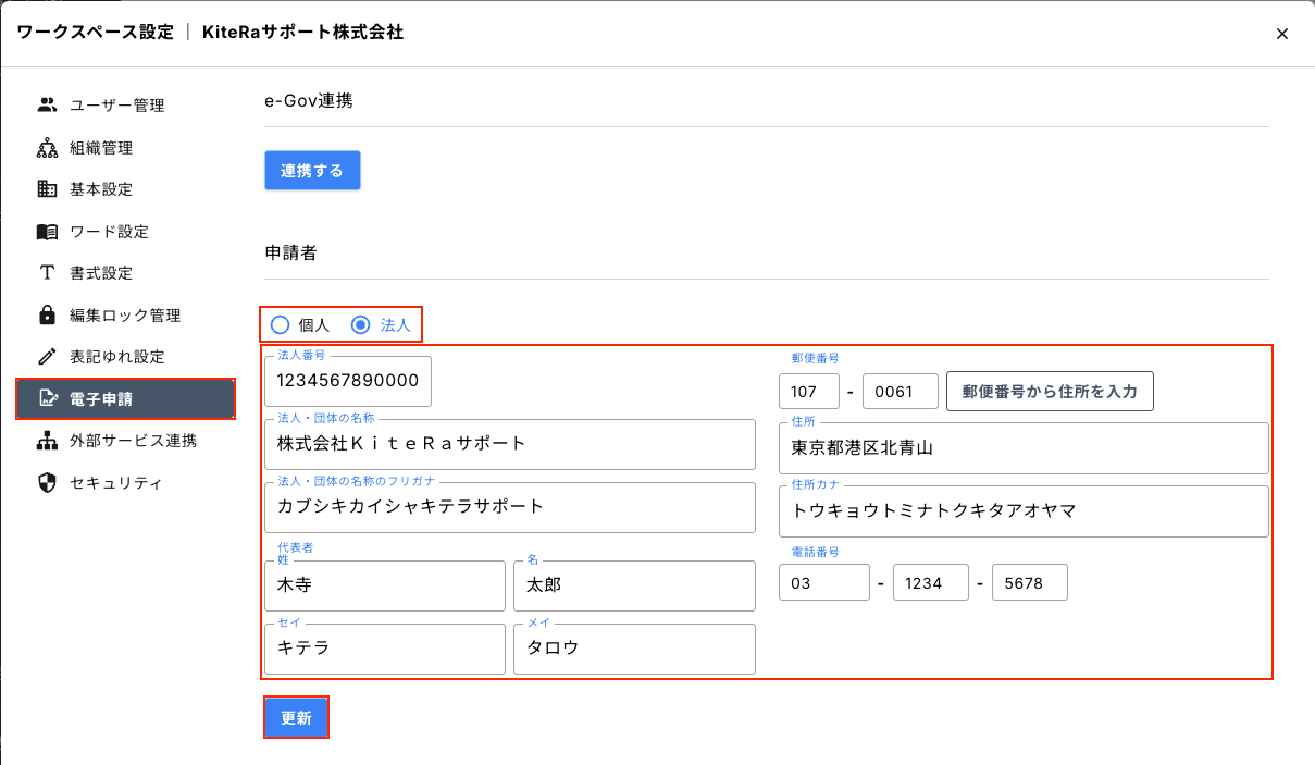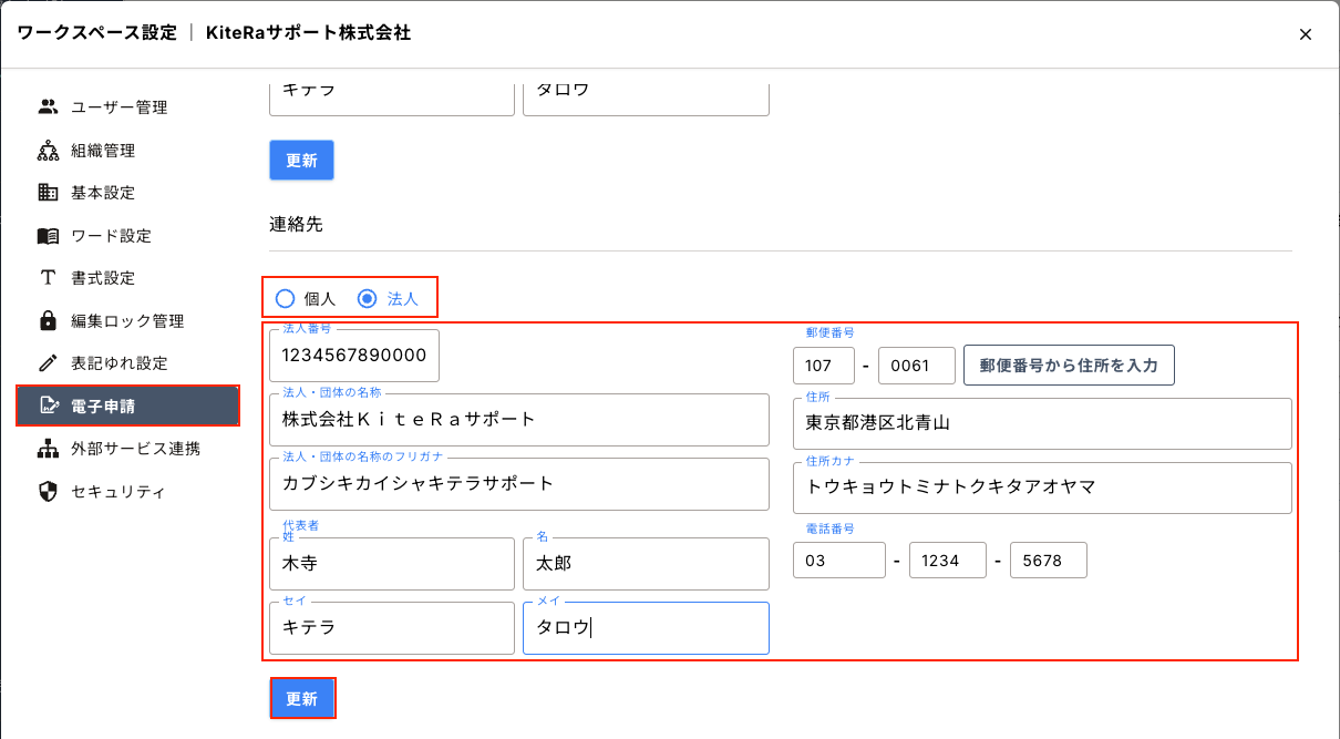 1.連絡先欄に申請者情報と同様の企業情報を入力