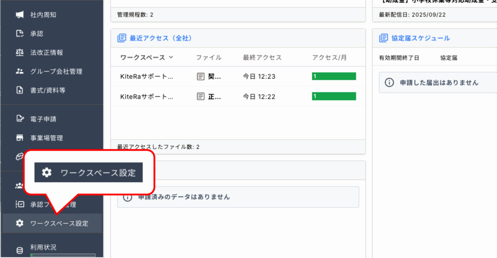 1.左側メニューの[ワークスペース設定]をクリックし、[編集ロック管理]を開く