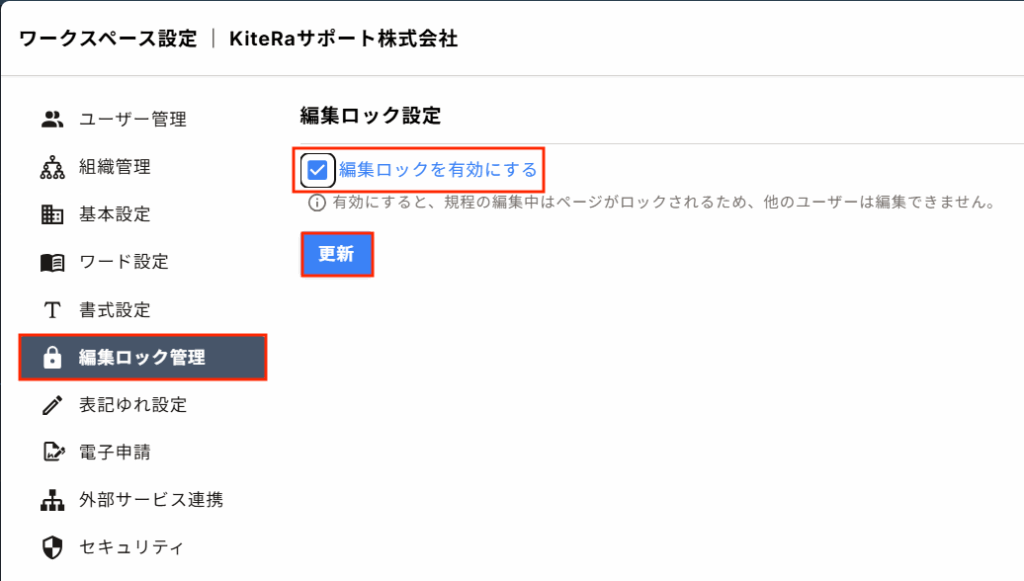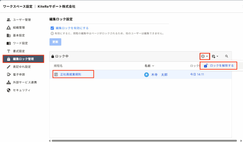 1.左側メニューの[ワークスペース設定]から[編集ロック管理]を開く