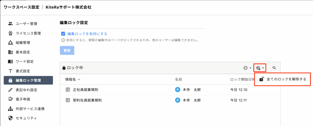 全ての規程のロックを一括で解除する場合は、一括操作から[全てのロックを解除する]をクリック
