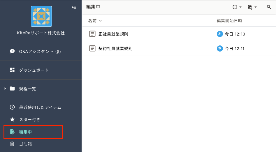 自分が編集中の規程は左側メニューの[編集中]に表示され、