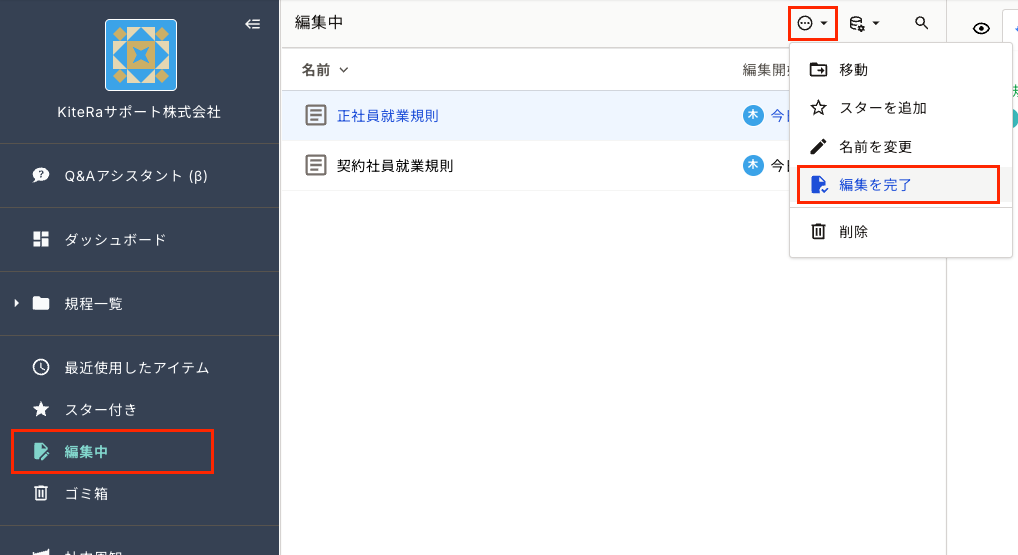 [編集中]メニュー内で規程を選択し、[…]の[編集を完了]をクリックで解除することも可能です。