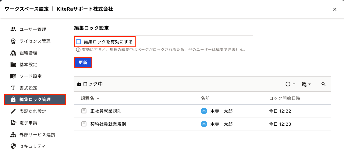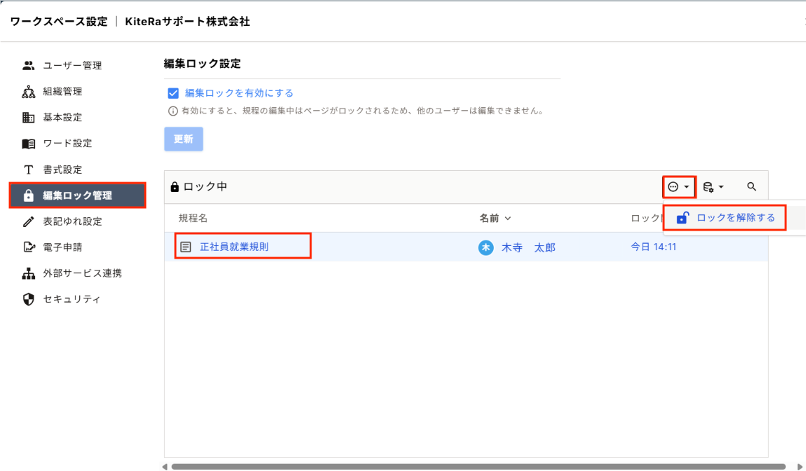 1.左側メニューの[ワークスペース設定]から[編集ロック管理]を開く