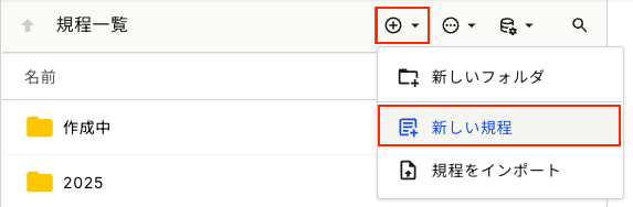 1.規程一覧画面で[+]ボタンをクリックし、[新しい規程]を選択