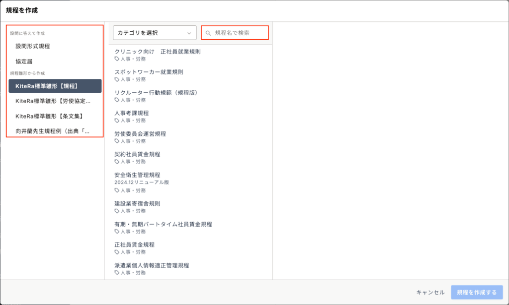 2.[規程を作成]画面の左側で探したい規程の形式を選択し、