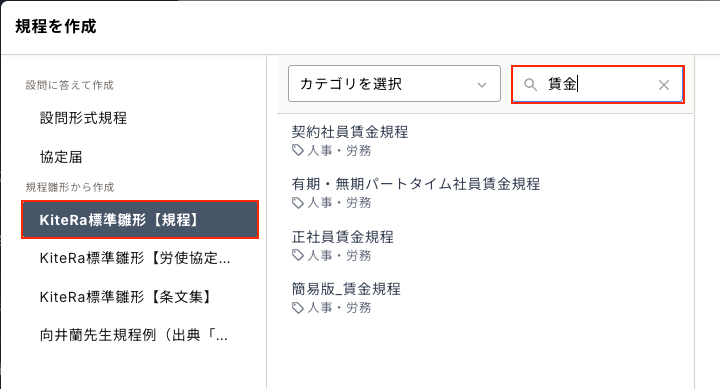 画面左側の形式は[KiteRa標準雛形【規程】]を選択し、検索窓で「賃金」と入力します。