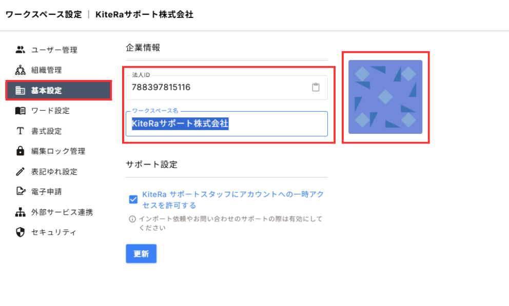 法人IDの確認とワークスペースの名称およびアイコンの変更ができます。