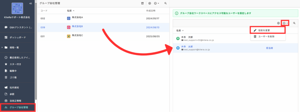 2. 役割変更の操作を行いたいグループ会社をクリックし、