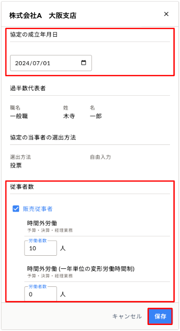3. 協定の成立年月日、業務の種類、労働者数を入力し、保存