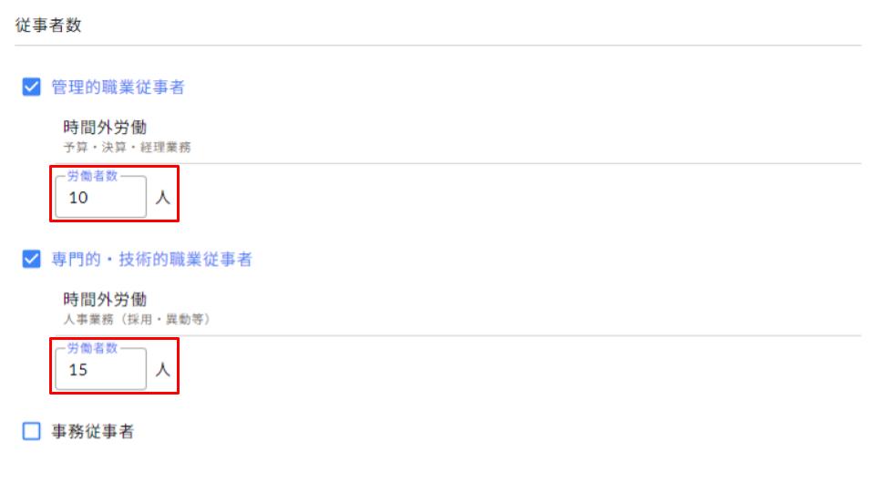 時間外労働等の欄に人数を入力し保存すると、プレビュー画面に反映されます。