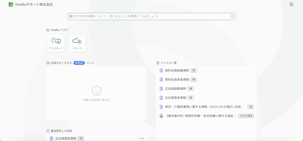 社内規程について質問すると、 KiteRaに保存された規程を元にAIが要約した回答が表示されます。