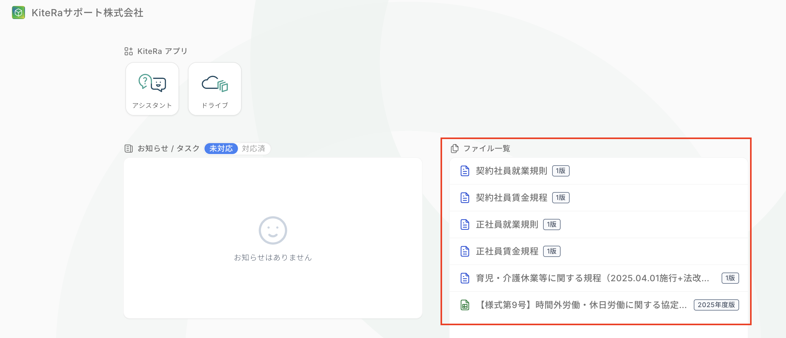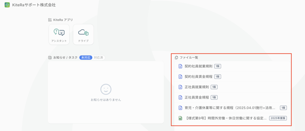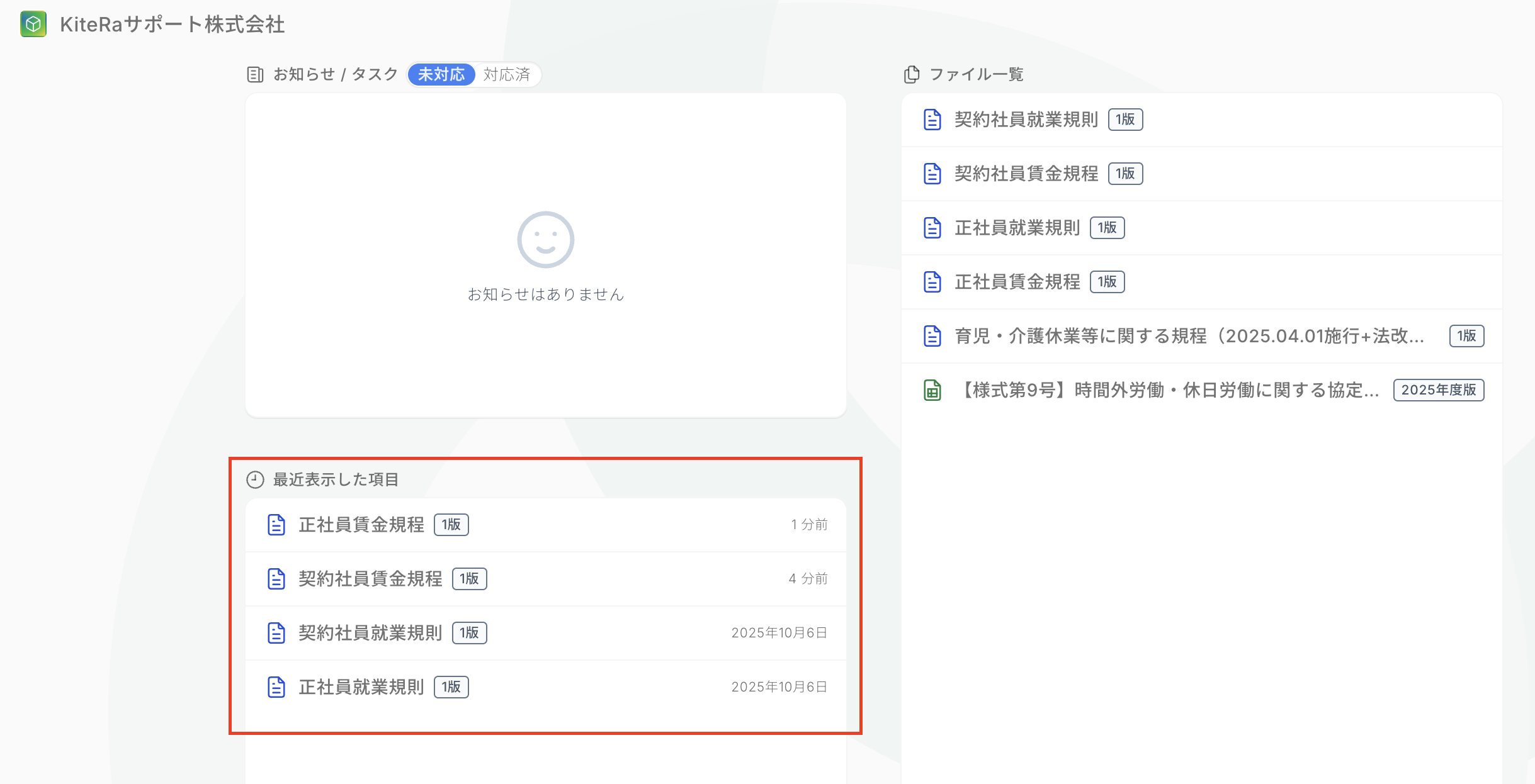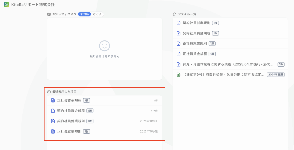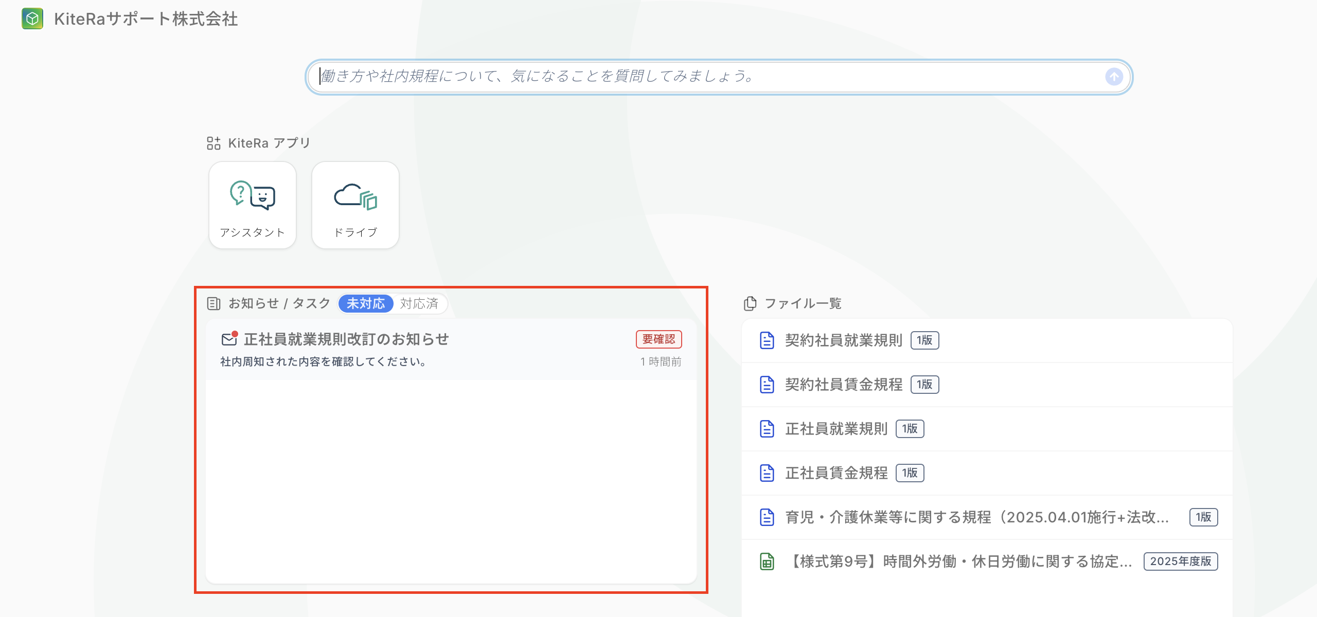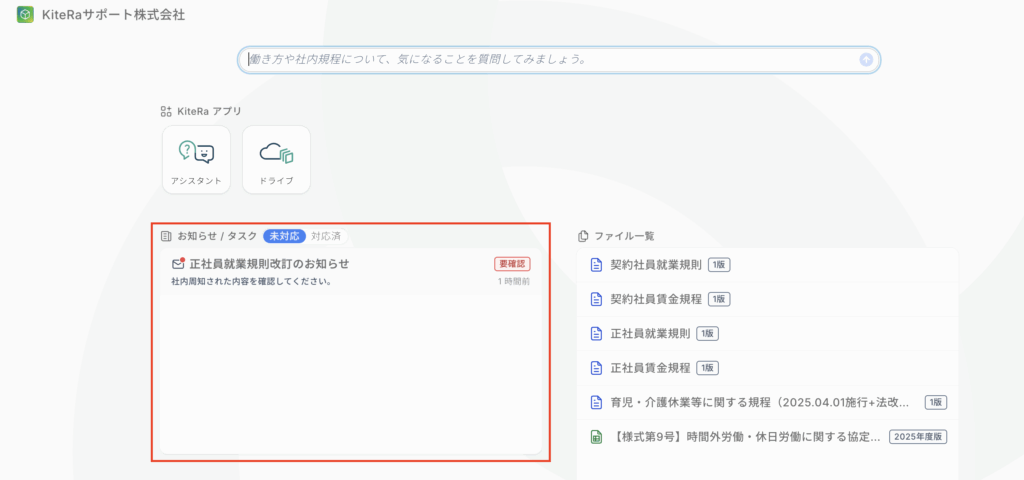 規程公開時の社内周知や意見書の入力依頼など、確認・対応すべきお知らせ/タスクが表示されます。