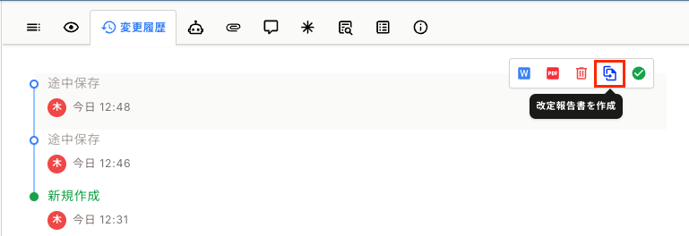 - 改定報告書を作成した変更履歴で版を取り消すと、作成した報告書は完全に削除され復元できなくなります。