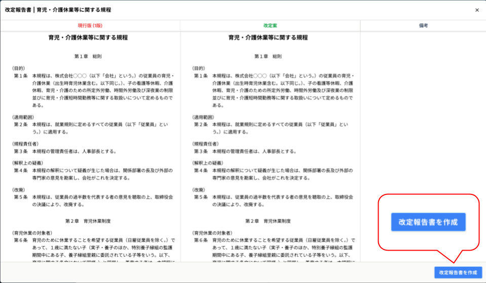 新旧対照表、改定の概要、備考の構成で作成できます。