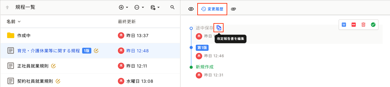 2.[変更履歴]で最新の履歴にカーソルを合わせ、[改定報告書を編集]をクリック