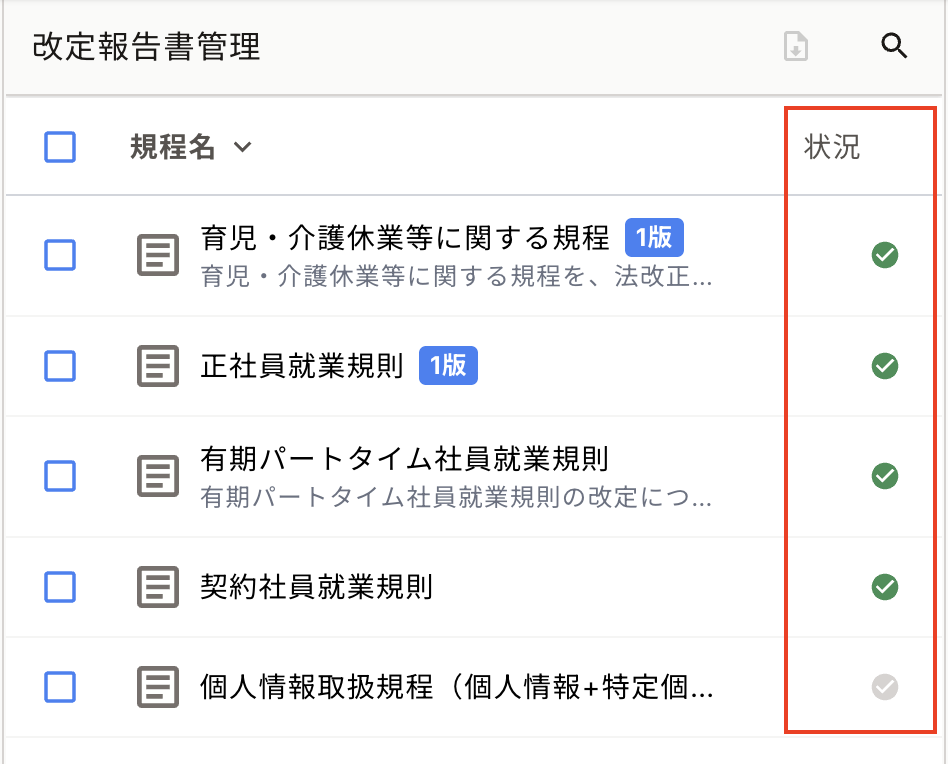 ・緑のチェックが付いている:改定報告書を作成済みの規程