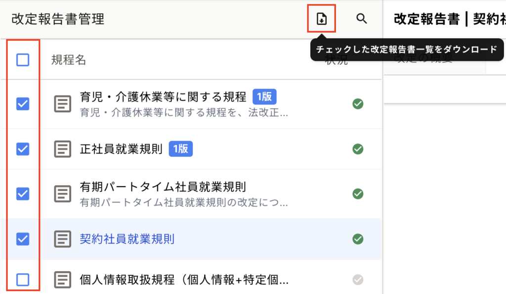 1.一覧でダウンロードしたい規程名左側にあるチェックボックスにチェックを入れる