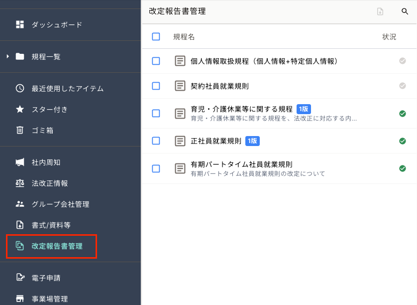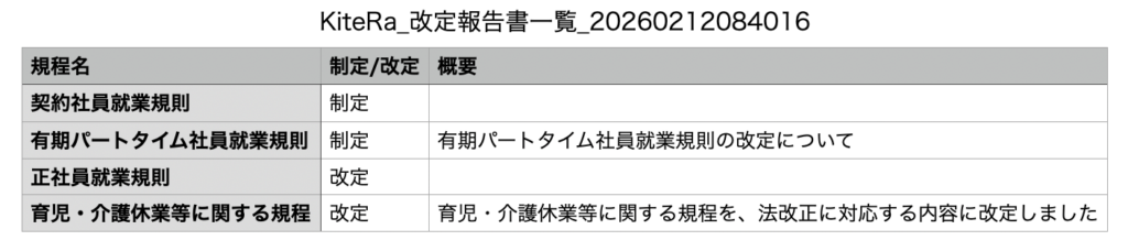 KiteRaの[改定報告書管理]メニューでは、改定した規程を一覧にして表示したり、改定報告書の作成状況を確認することができます。