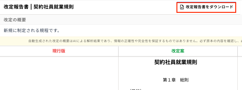 画面右上[改定報告書をダウンロード]をクリックして改定報告書をダウンロード