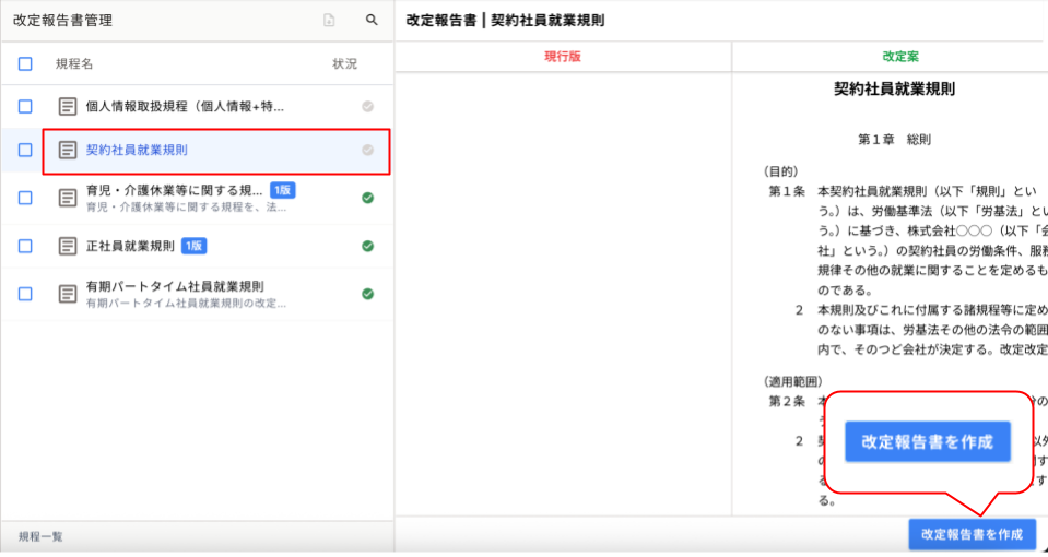 1.規程を選択し、画面右下の[改定報告書を作成]をクリック