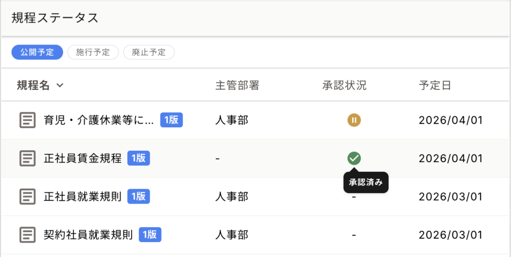 以下の日付を設定した規程が、それぞれのステータスタブに表示され、クリックで表示を切り替えることができます。