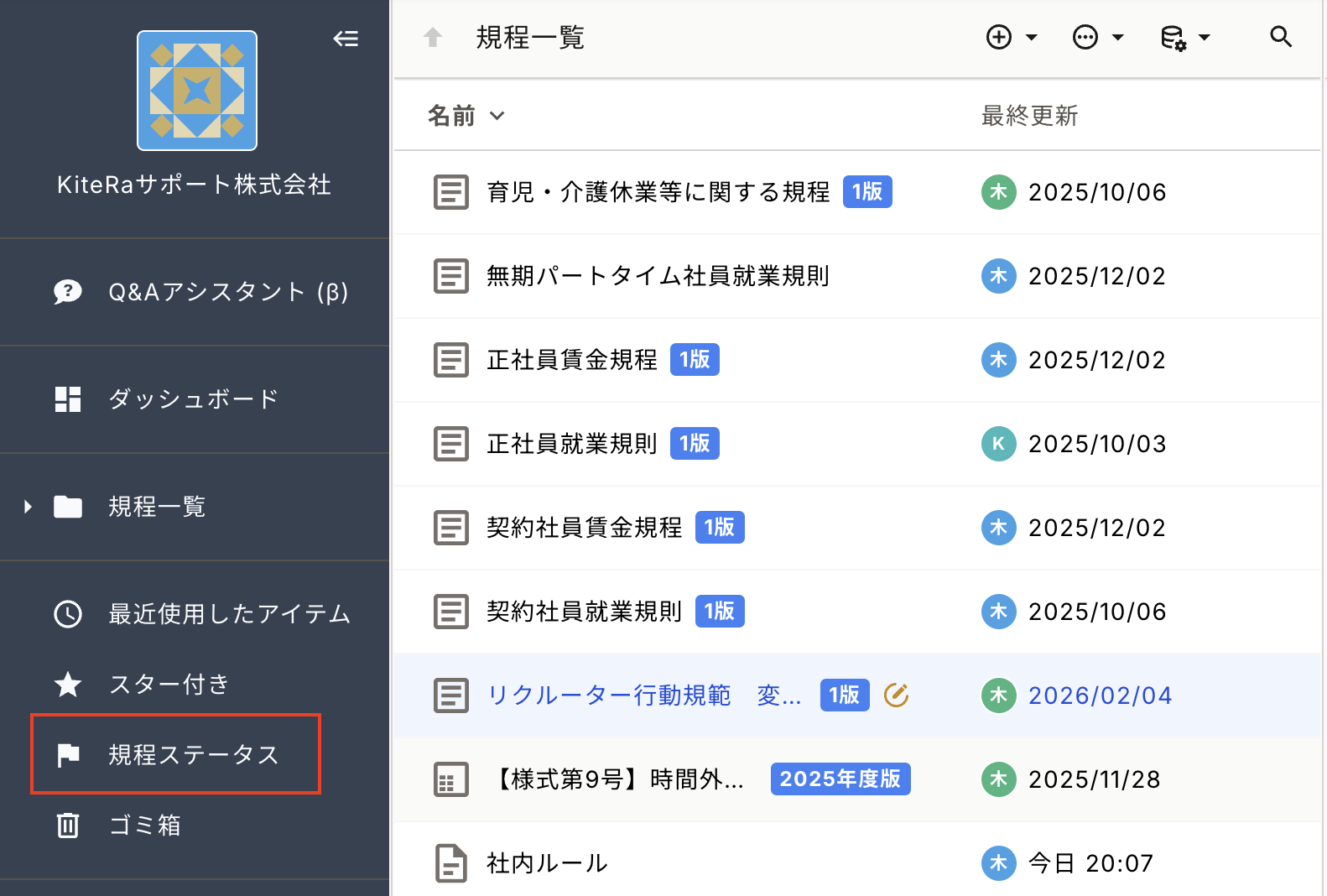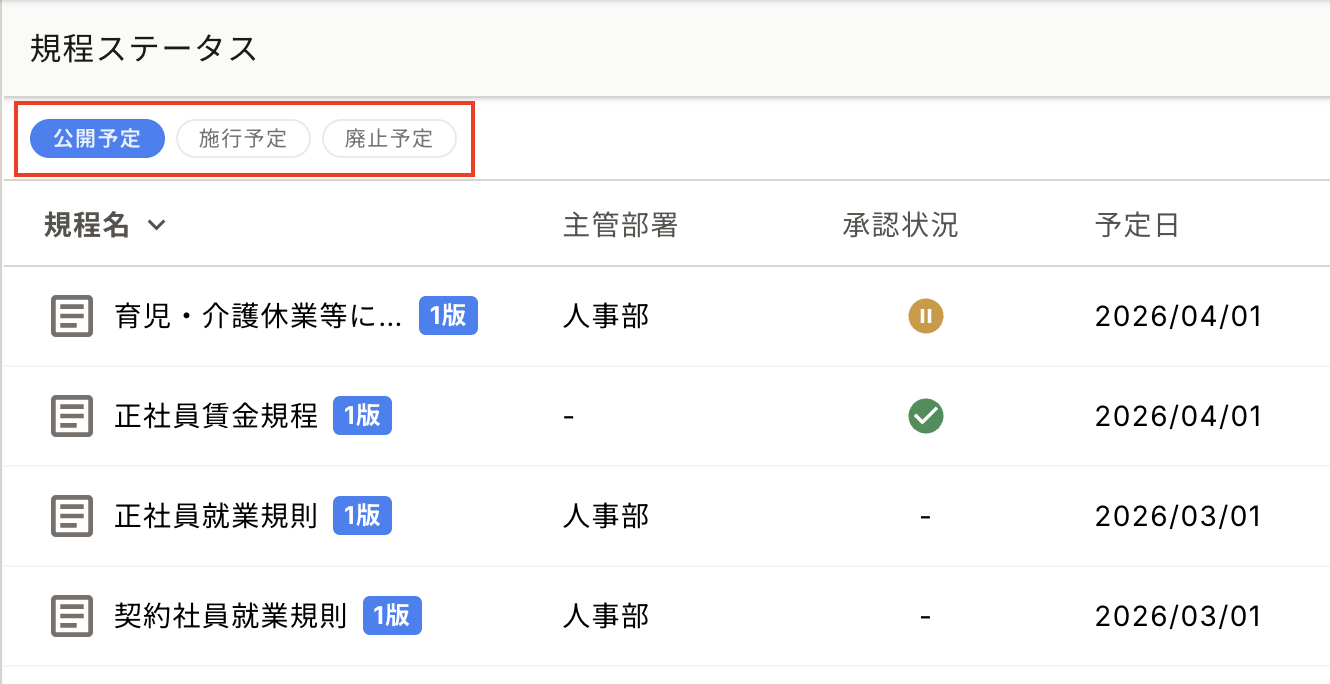 以下の日付を設定した規程が、それぞれのステータスタブに表示され、クリックで表示を切り替えることができます。