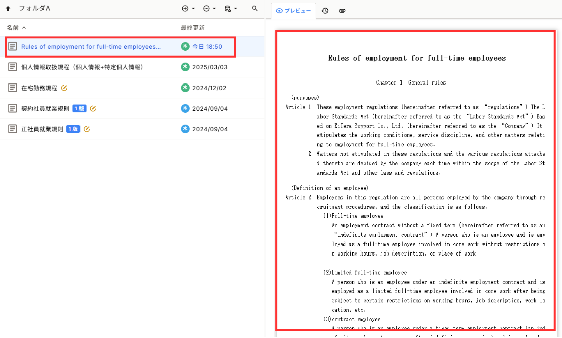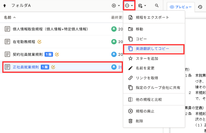 ※プレビュー画面で規程を選択した言語に翻訳したい場合は、規程を翻訳するのページをご確認ください。
