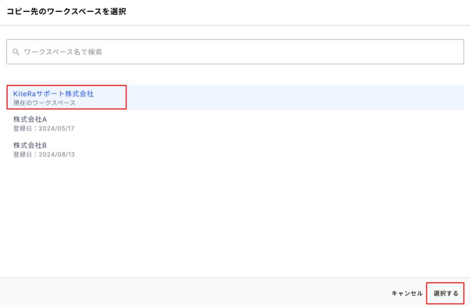 3. コピー先のワークスペースを選択し、[選択する]をクリック