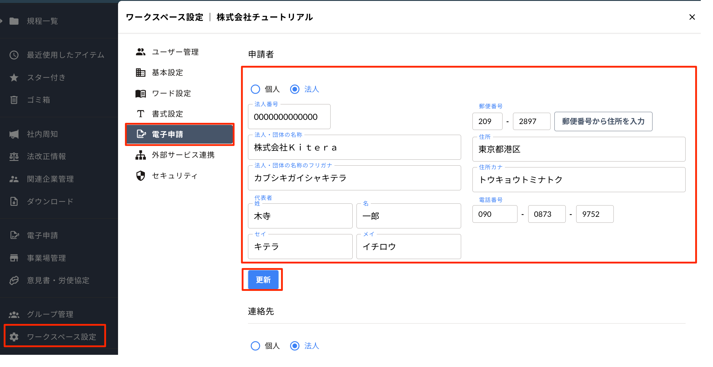 ・自社の担当者がKiteRaを使用して電子申請をする場合は、連絡先にも申請者情報と同じく、会社の情報を入力します。