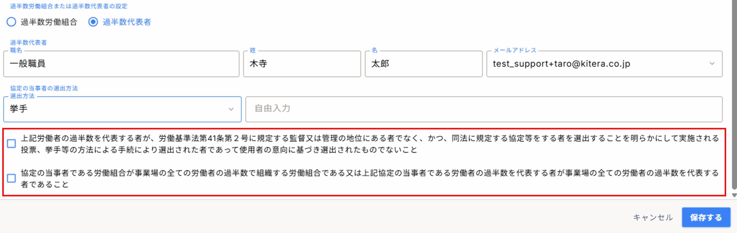 ※過半数代表者の情報を変更すると、自動的に画面下部のチェックが外れます。
