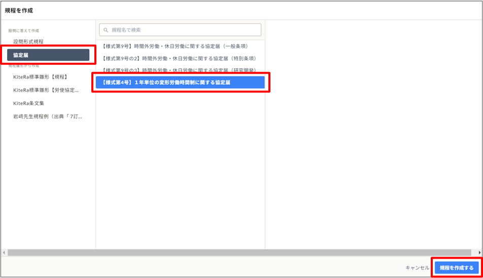 「【様式第4号】1年単位の変形労働時間制に関する協定届」を選択し、[規程を作成する]をクリック
