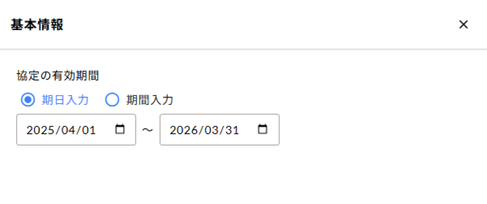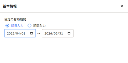 協定の有効期間は、ラジオボタンで[期日入力]または[期間入力]のいずれかの入力方法を選択することができます。