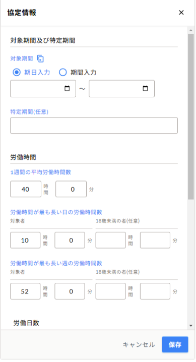 2. 協定情報の入力フォームが開くので、「対象期間」、「特定期間」、労使協定の内容として1週間の平均労働時間数、総労働日数等の情報を入力