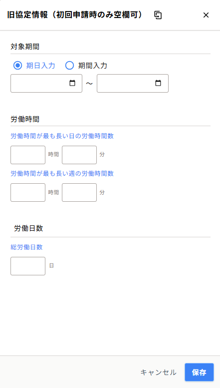2. 旧協定情報の入力フォームが開くので、[対象期間]等の情報を入力