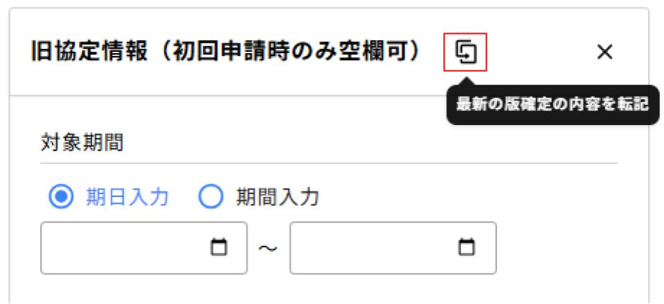[最新の版確定の内容を転記]ボタンをクリックすると、現時点で版確定されている最新の版の協定内容を旧協定情報としてコピーすることができます。