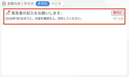 [お知らせ/タスク]の未対応欄に意見書入力依頼が表示されます。