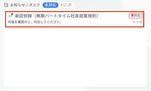 [お知らせ/タスク]の未対応欄に承認依頼が表示されます。