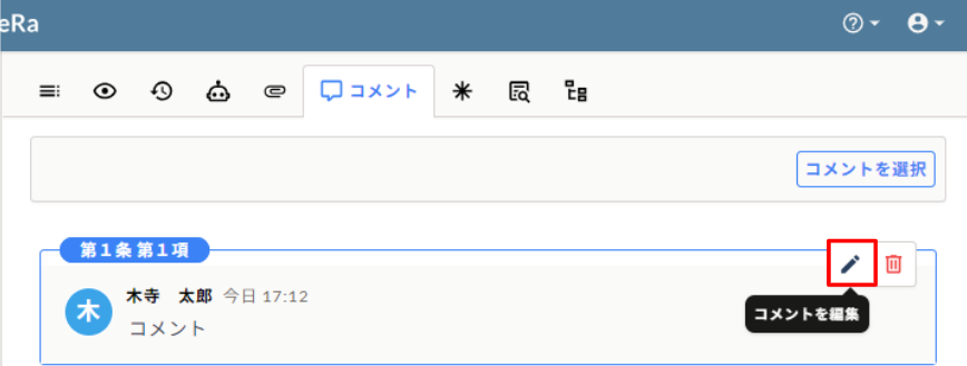 1. 編集画面でコメント/注釈を記載したい条文をクリックし、ボックスの右横に表示される[コメントを追加]/[注釈を追加]をクリック