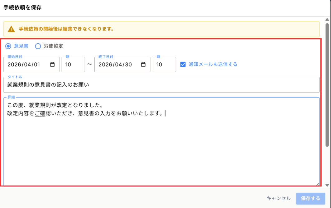 チェックを入れると、依頼に設定された[開始日付・時]に依頼が公開された旨をメールにて各事業場の過半数代表者に通知します。
