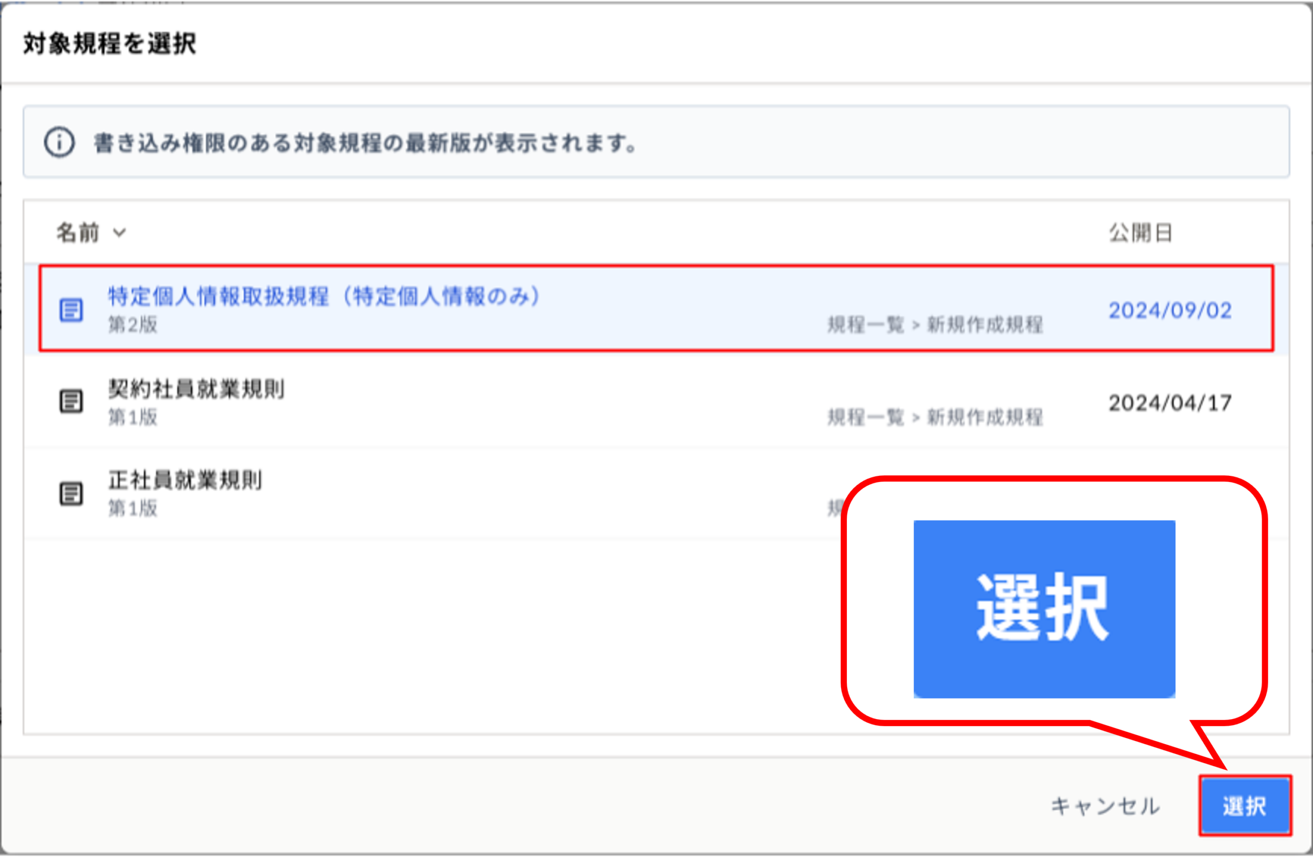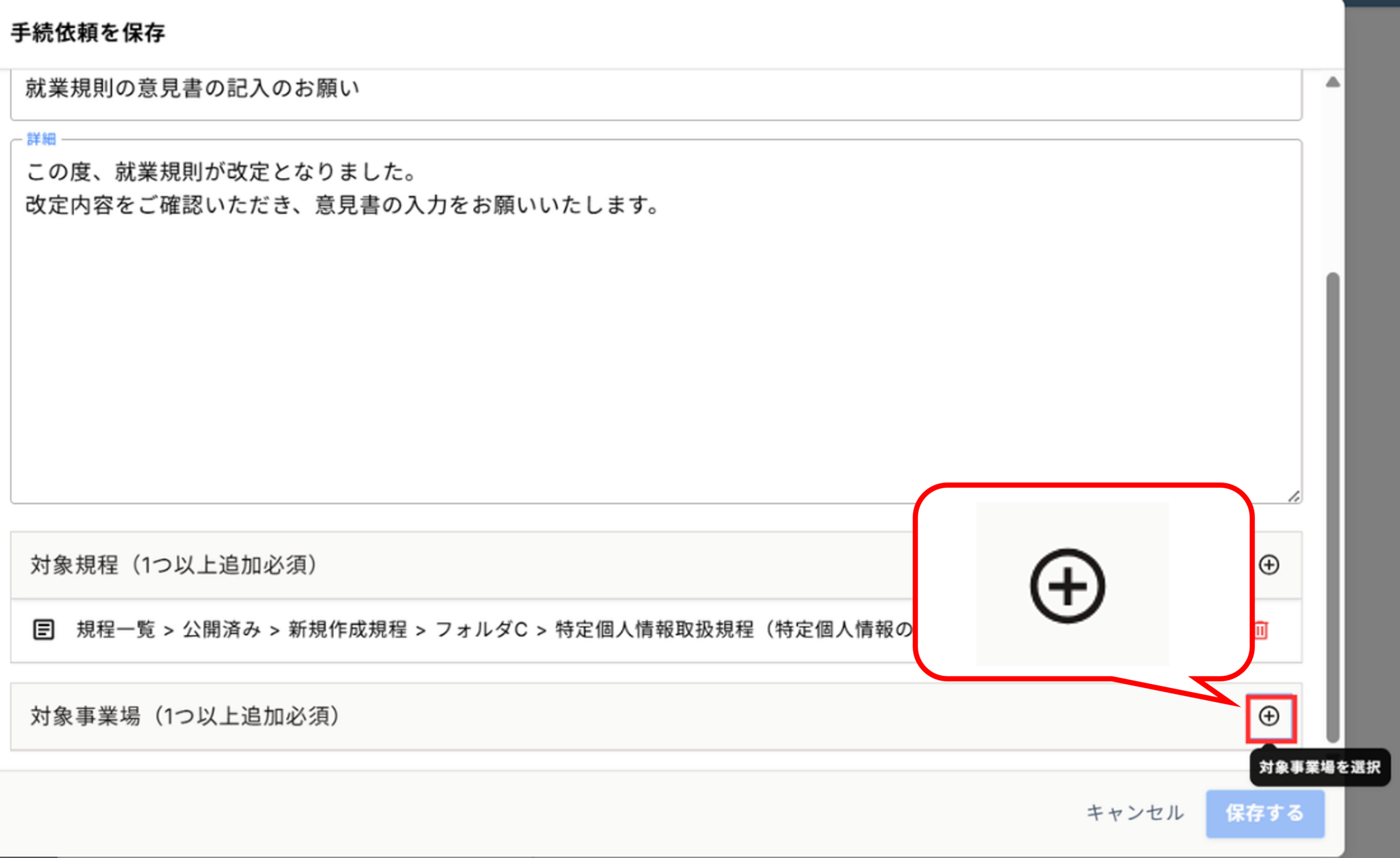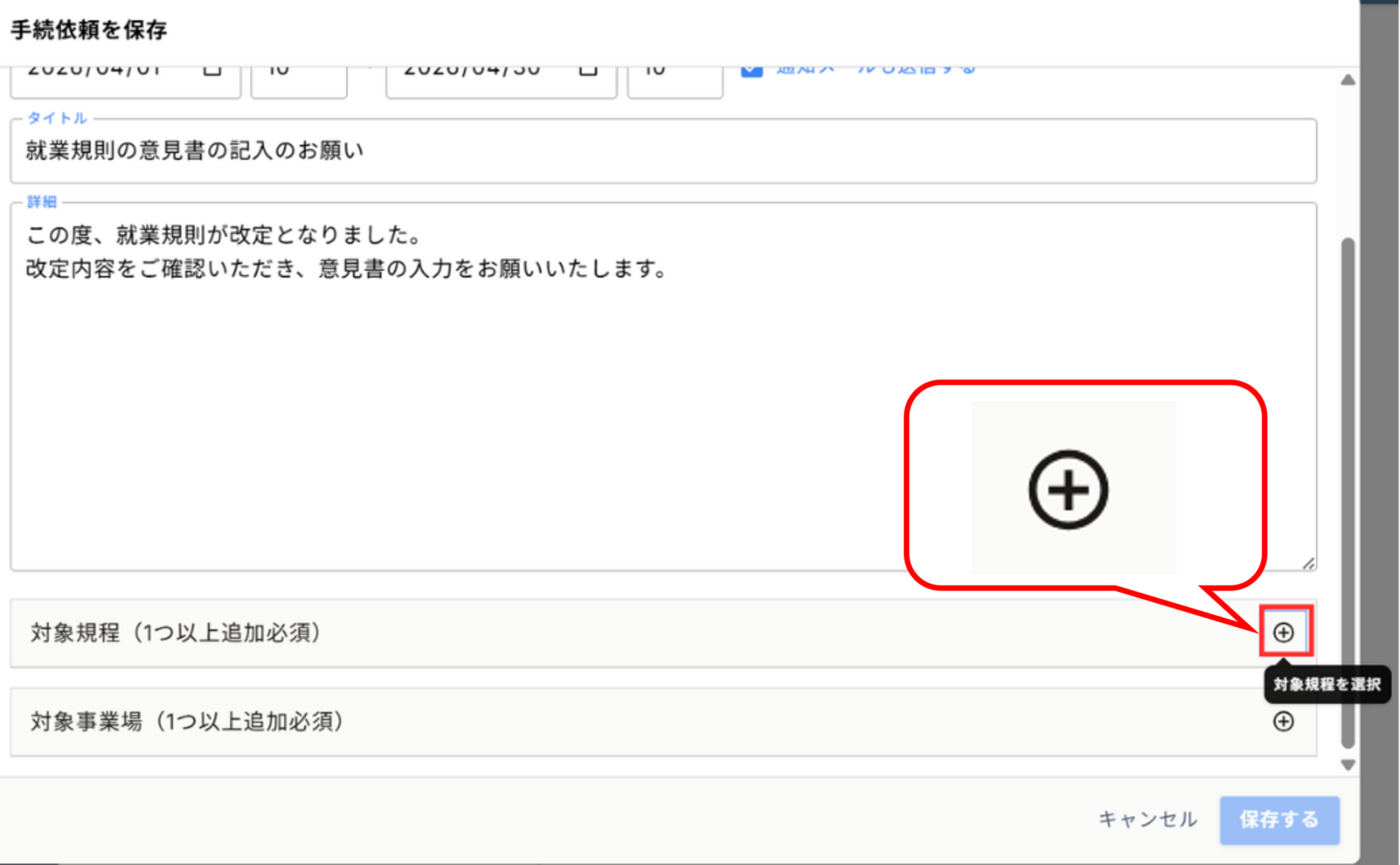 5. 対象規程の[+]ボタンをクリックし、入力を依頼する規程を選択する