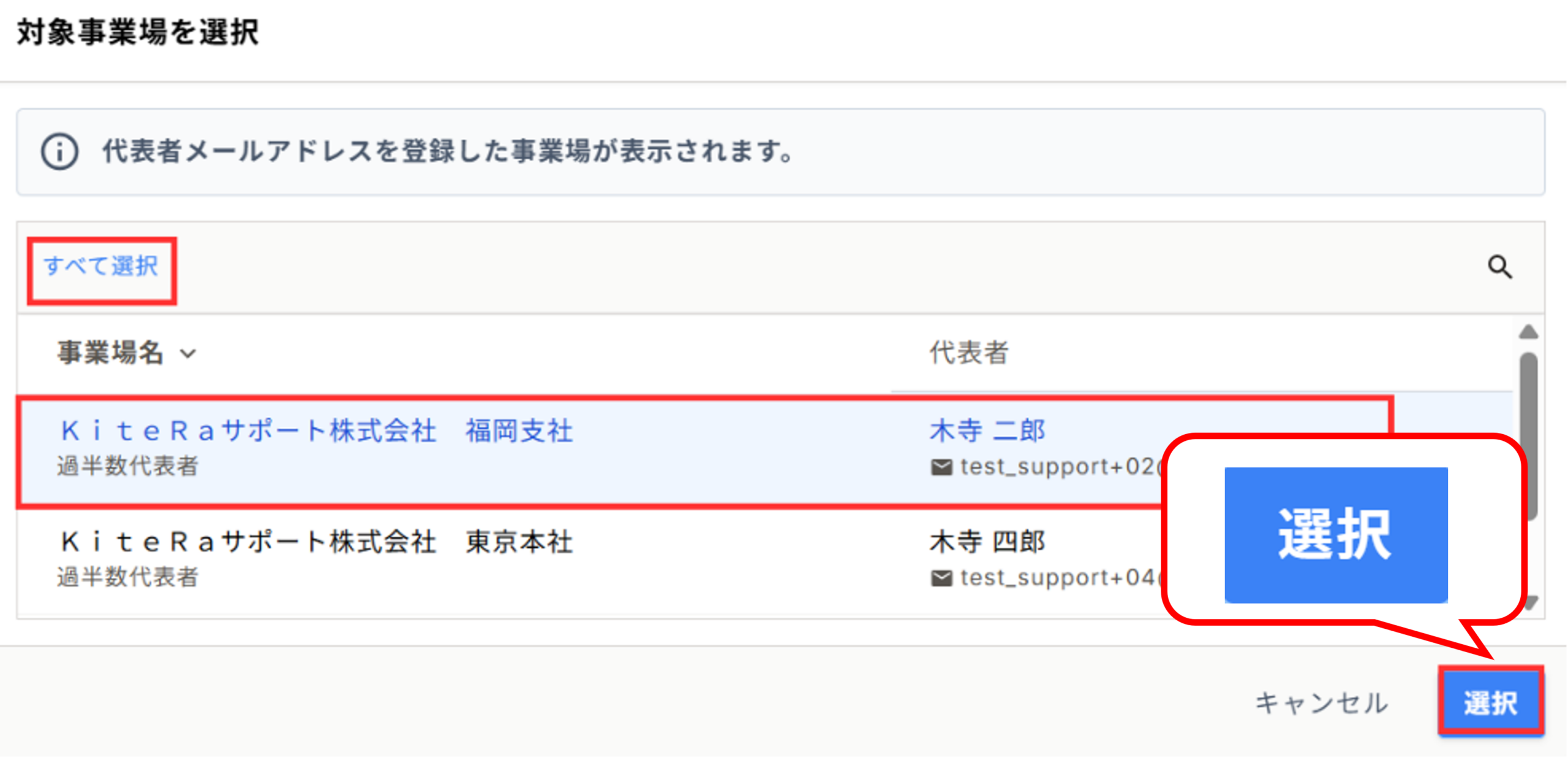 意見書自動作成機能を利用して作成・回収した意見書を使用してKiteRa Bizで規程の届出(電子申請)を行う場合、電子申請の届出事業場の選択(意見書添付)画面で、意見書が各事業場に自動で添付されます。