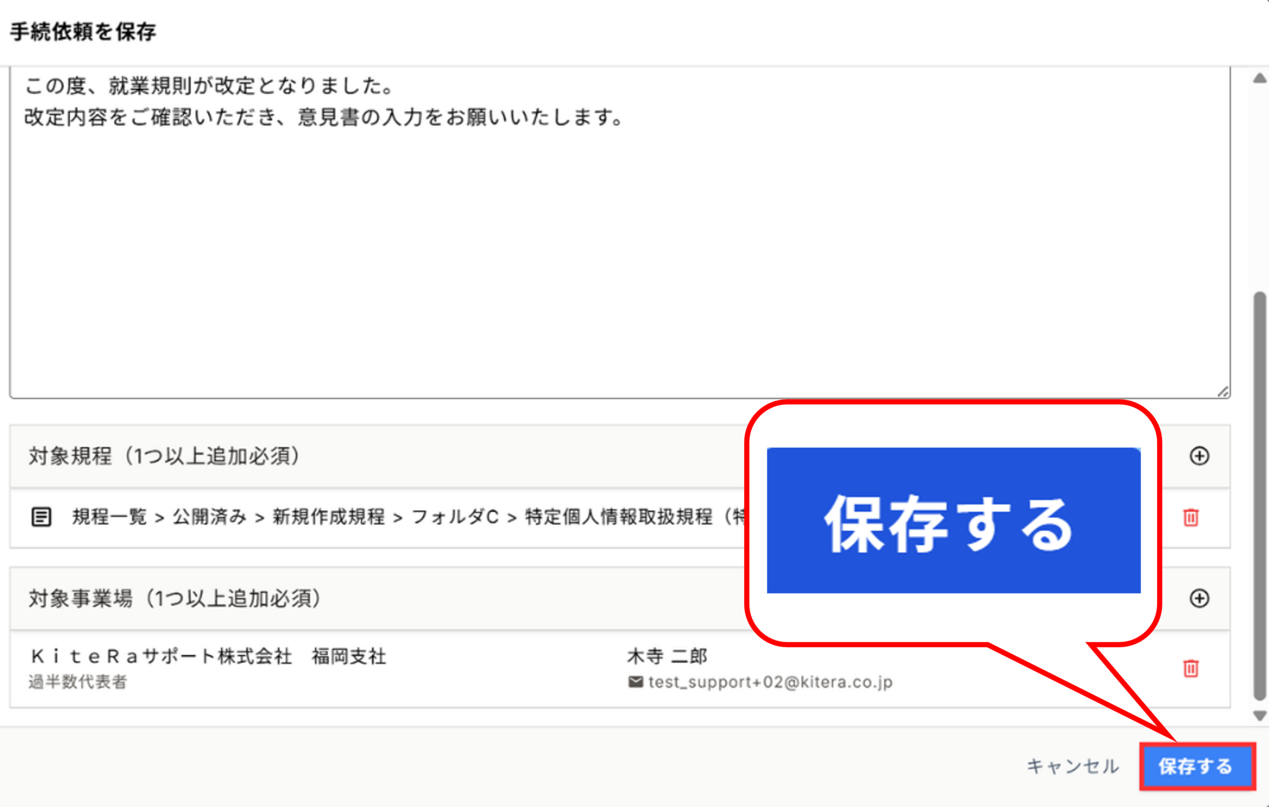 規程の策定・改定を行った場合、過半数代表者への意見書の入力依頼をKiteRa Biz上で行うことができます。