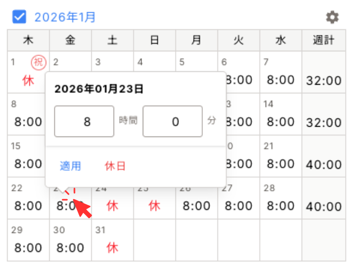 1年変形カレンダー機能において、各日の労働時間を入力する際の操作性の改善を行いました。