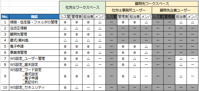 ※全ての操作が行えるものが「◎」、閲覧のみ可が「△」、非表示のものが「ー」となります。