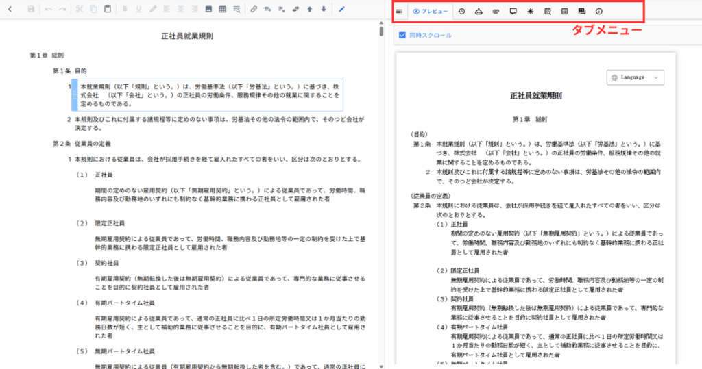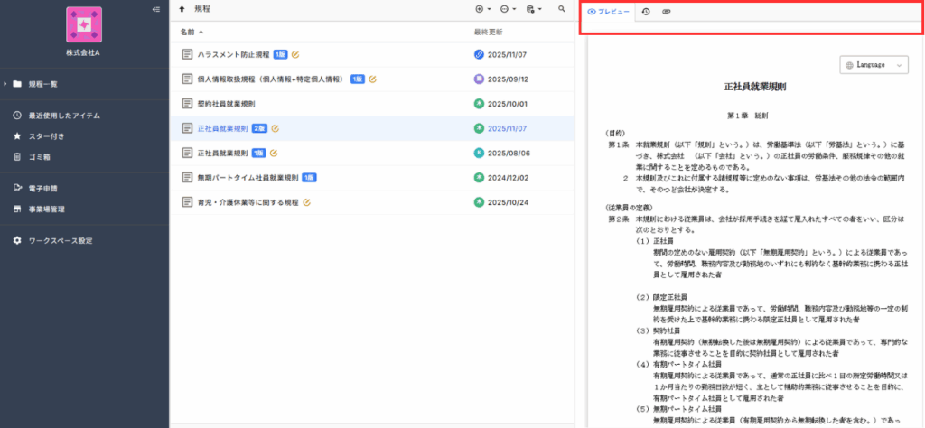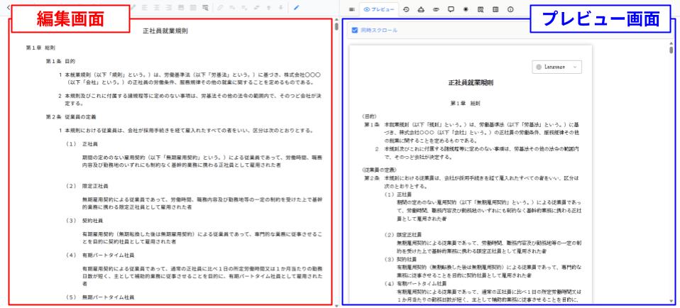 画面左側で規程の編集画面、右側の「プレビュー」タブで規程のプレビューを開くことができます。